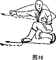 上動不停,兩脚碾地,體左轉90度,使兩腿成插步,然後兩腿下蹲成歇步,右 拳向右侧衡擊,拳心向下,左拳向外撩,然後屈肘抱於腰間,目視右拳(圖36)。