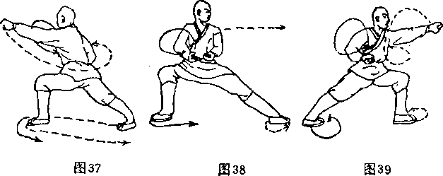 弓步衝拳接上動作,兩脚碾地,體左轉90度,使兩腿成左弓步,同時^左 拳向前猛衡,拳心向下,右拳向外療劈,然後向内屈財抱於腰間,拳心向上,目視 左拳(圖39)。