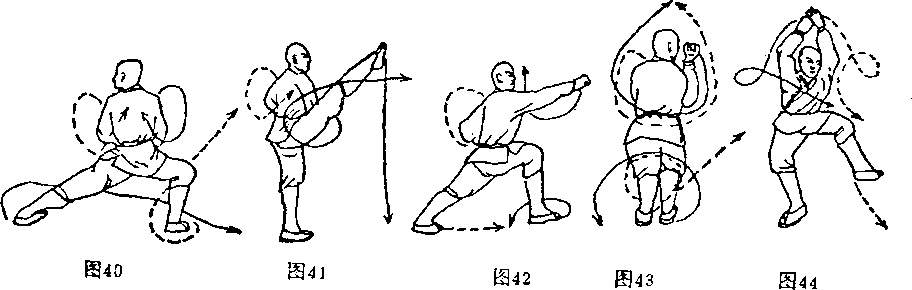 跳步抖拳兩脚起跳,體向左轉90度,使兩腿落成右弓步,同時兩拳由外 向内屈肘,抱於腰間,目視左後方(圖40)。