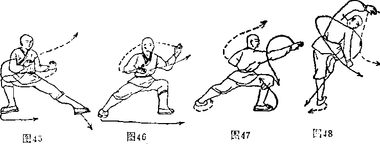 鷂子翻身右脚向右移一步,雙脚起跳,向右轉身,體右轉180度左脚向 左彈踢,同時兩拳隨身環展,然後在頭上合擊,目視左脚(圖44