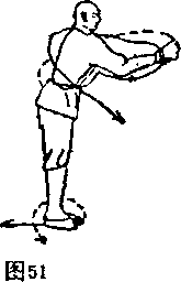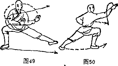 弓步搶手起身,兩脚艰地,向左轉體90度,抬右脚向前上一步t使兩脚 成右弓步,右手由後向前搶出,掌指向前,然後左掌變拳,向外撩端於腰問,目視 右手(圖50)。