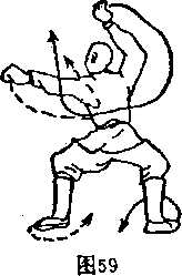 馬步架打右脚向後落一步,兩脚碾地,向右轉體90度,兩腿屈膝成馬 步,同時兩掌變拳,左拳向左侧衡擊,拳心向下,右拳由内向外劃孤,架於頭上前 方,拳心向前,目視左拳(圖59)。