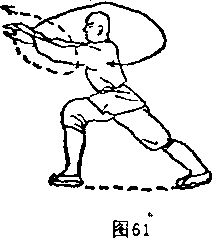 龍王唤雨兩脚碾地,向左轉體180度,抬右脚向前往左擺踢;同時,左拳 變掌,向前向右拍擊右脚掌内侧,右拳隨身向外劃弧,然後抱於腰間,目祝左手 (圖 61)。
