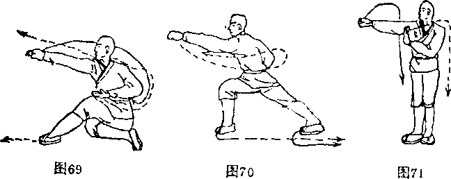 歇步劈拳兩脚向左跳步斡身,體左轉180度,左脚在前落成歇步,同時 右拳向前方衡擊,左拳变掌向外撩,然後向内屈肘端於腰間,目視右拳(圖69)。
