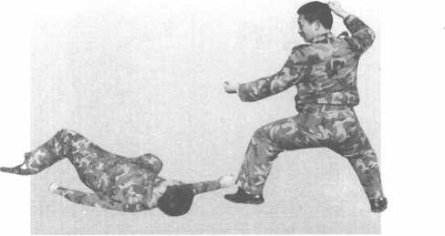 【要领分析】此动作由防到攻至摔倒对方,动作要一气呵成, 快若闪电,否则很难奏效。此招摔法的关键是贴紧对方,并用左 脚捆绑住对方右脚。而要成功做到这一点难度甚大。当我贴紧对 方时,极易遭受对方攻击,要想不遭到攻击,只有设法迫使对方 不出招,要么用力用招缠绕住对方双手,要么以极快速度使对方 无法及时反击。当我用左脚捆绑住对方右脚时,我左脚亦被对方 右脚捆绑住,是所谓兵走奇招、险招的打法。此时比的是桩功 稳、速度快、力道猛、抢占先机、占主动。我双手与对方接触 时,要用绵力将对方手臂缠住,待脚捆绑住对方的一刹那,变力 将对方摔倒。