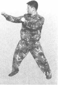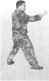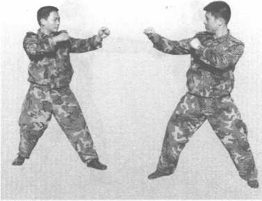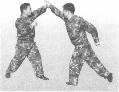 示例6:双方对峙(图9-22)。对方前脚滑步,用右拳直冲 我面部。我略为后撤,避开对方凶猛攻势,同时出左手向左外方
