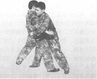 转,自对方腋部穿出,同时,左手用力下压对方右臂(图9- 33)。紧接着,我左脚迅速上步,插至对方右脚后侧,捆住其腿, 同时右手从对方左腋部穿出并锁抱住对方腰部,左手紧压对方右 肩(图9-34),然后左手向前推击对方右肩,右手锁抱着对方腰部右旋发力,将对方摔倒。(图9-35)
