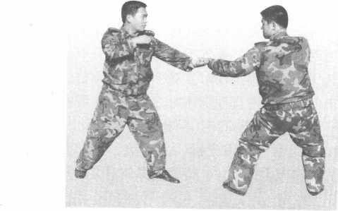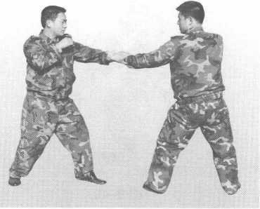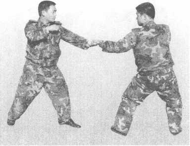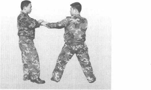 双方互抓肩纠缠是街头打斗极常见的现象,若 不得法,那么双方从早纠缠到晚,也无法分出胜负。若你身处此 态,单打独斗,对你亦无损害,若遇众人围攻,你不fm时将对 方击倒,那么等待的必是你瞬时被别人击倒。当我用左手前推、 右手回拉时,对方必会做出相对反应,以右肩前顶、左肩回拉来 顶抗。此时我突然换力,以左手回拉、右手前推,借助对方之 势,发力使对方重心失控。待对方突感不妙,定想将前倾的重心 调整好。因我用力在拉,对方想调整重心,定会让重心后仰以抵 消前拉之力。我在对方重心后仰未稳之际,突然上步捆绑其脑,, 使其不能逃脱,力从丹田起而发于劳宫,向前发力,致方后倒 于地。发力要迅猛、浑厚,有排山倒海、无坚不摧之势。