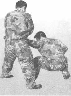 【要领分析】对方右拳直冲,气势如虹,若用力对抗,难度 较大。我略撤步,避开对方攻势,对方右拳就成了强弩之末。我. 出左手格挡抓扣对方右手,要即格即抓即用力回拉。对方右拳前 冲,身体重心前倾,在抓扣对方右拳瞬间即用力回拉,使对方重 心极度前倾,为我下潜挑裆创造有利条件。因为我上步、下潜、 挑裆路线长,幅度大,所需时间也较长,只有在对方重心极度前 倾时才易完成。若在对方重心未定时贸然出击,很容易遭到迎面 脚的攻击,或让对方退步变招。只有在其重心前倾时,才能无奈 地承受我的攻势。下潜、抓手、挑裆动作要协调一致,即挑即用 肩将对方扛起。马步要稳,右手上挑时,力从腰发,整个摔法要 快捷,以免对方用招解脱。对方在被摔出后,其惯性是向左下方 摔出,我在将对方摔出之后,迅速放手,以不阻碍惯性,使其摔 得更远、更痛。