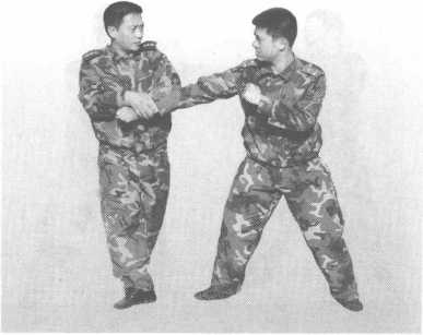 【要领分析】借招发招的打法,必须讲求快。对方既然先发 了第一招,往往接二连三地发动攻势。我在左腕被抓后想出招制 敌,则动作要快,必须赶在对方再发招之前。压肘时要配合上 步、转身之势,压肘定要贴紧对方右臂,切不可滑动。压肘发力 要正对肘关节外侧。发力要快、要脆,不然一旦对方屈臂反抗, 则此招很难奏效。