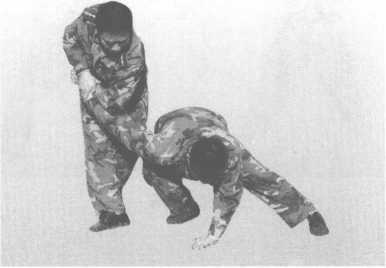 接着,以头部撞击对方头部,在方头部受创后仰时,我双臂向外展开,身体前压,双臂向前发 力将对方压倒。(图9-30)