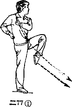 ①左腿蹬直,右腿屈膝提起(图二46①)。②左脚脚尖微内扣,上体微右转,右腿伸 直向右上方弹踢!眼看右脚(图二46②)。