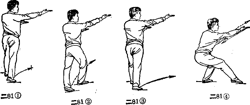 目视前方(图二63③)。④左脚向前落步成左弓步;同时,右拳向前冲拳,拳面朝前,左掌 收于右上臂内侧,指尖朝上;眼看右桊(图二63④〉。