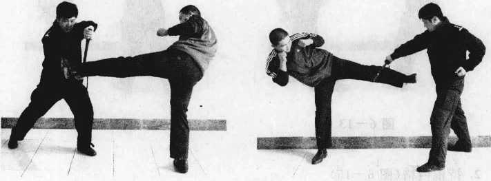 适用条件:如遇高大强壮之敌,或双手插兜,或手中提物等,可采用此招。