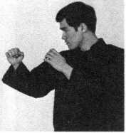 上勾拳应用于近战。这种打法(屈臂向上、拳心向内),前后手都可以 运用。然而对付一个快速运用长距离标指的直立对手时,这种打法几乎没 有一点用处。但是如果要对付一个低头冲来,并疯狂挥拳的对手,那自然 要采用这种打法。