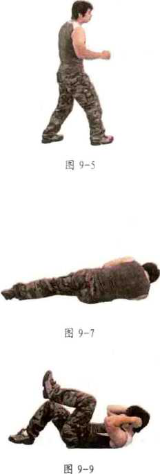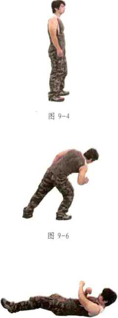 动作:从高处跳下,欢脚着地,脚着地的过程是前脚掌先着地,然后再过渡 到脚跟着地;同时膝部微屈,身体下蹲,上身微向前倾,用心体会在下蹲过程中 的腿部肌肉反向发力;双手打开,手肘前屈,以做好双脚承受不了地面撞击随时 向前扑倒采用滑动摩擦技术或滚翻受身技术的准备(图9-1、图9-2)