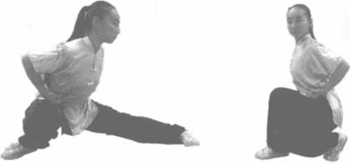 两脚左右开立,右腿屈膝全蹲,大腿和小腿靠紧,臀部接近小腿。右脚全脚着地,脚尖和膝关节外展,左腿挺直平仆,脚尖里扣,全脚着地。两手抱拳于腰间。眼向左方平视(图3-4)。仆左腿为 左仆步,仆右腿为右仆步。