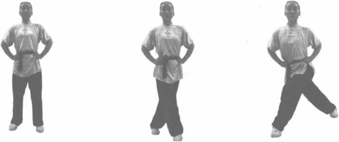 预备姿势:两腿开立,两手叉腰。