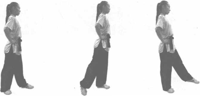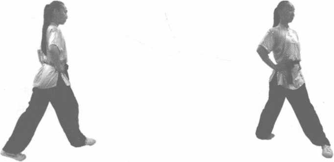 动作说明:两腿略屈,两脚迅速连续向侧前方沿弧线行步。每步大小略比肩宽。眼向前平视。 (图3-15、图3-16)。