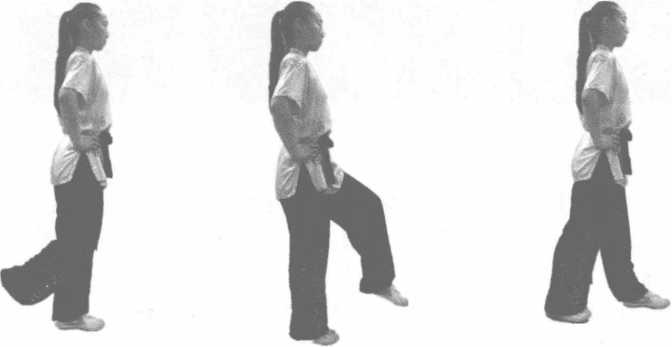 动作说明:后脚离地提起,脚掌向前脚处落步,前脚立即以脚掌蹬地向前上跳起,将位置让与 后脚,然后再屈膝提腿向前落步。眼向前平视(图3-12—图3-14)。
