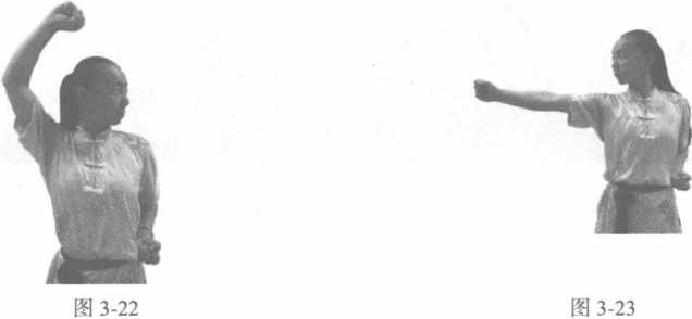 动作说明:挺胸、收腹、直腰,右拳从腰间向前猛力冲出,转腰、顺肩、在肘关节过腰后,右前臂内 旋。力达拳面,臂要伸直,高与肩平,同时左肘向后牵拉(图3-21)。练习时,可左右交替进行。