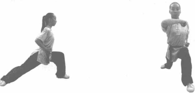 左脚向前一大步(约为本人脚长的4〜5倍),脚尖微内扣,左腿屈膝半蹲(大腿接近水平), 小腿与地面垂直。右腿挺膝伸直,脚尖内扣(约45° ),两脚全脚掌着地。上体正对前方,眼向 前平视,两拳抱于腰间(图3-1)。弓右腿为右弓步,弓左腿为左弓步。