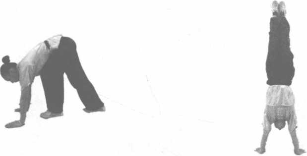 动作说明:屈体使两腿上摆,两手扶按两膝。两腿下打,挺腹,振摆而起(图3-77、图3-78)。 要求与要点:鲤鱼打挺时身体要折叠,腿的振摆要快速有力,两脚落地时不得超过肩宽。