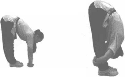 动作说明:上体前俯,两手尽量贴地(图3-43)。然后两手松开,抱住两脚跟腱,逐渐使胸部贴 近腿部,持续一定的时间再起立(图3-44)。