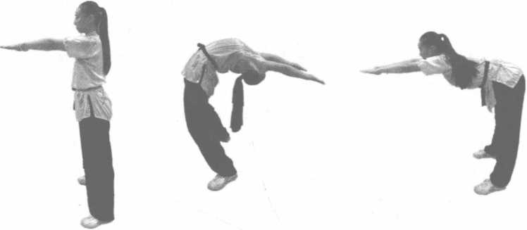 要求与要点:前后甩腰速度要快,两腿保持直立姿势,动作紧凑而有弹性。
