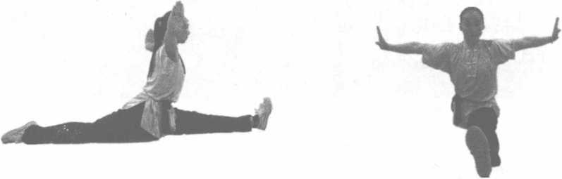 劈腿主要是加大髋关节的活动幅度,增进腿部的柔靭性。劈腿练习可结合压腿和搬腿进行。 两手左右扶地或两臂侧平举,两腿前后分开成直线。左腿后侧着地,脚尖勾起。右腿的内侧 或前侧着地(图3-54、图3-55)。