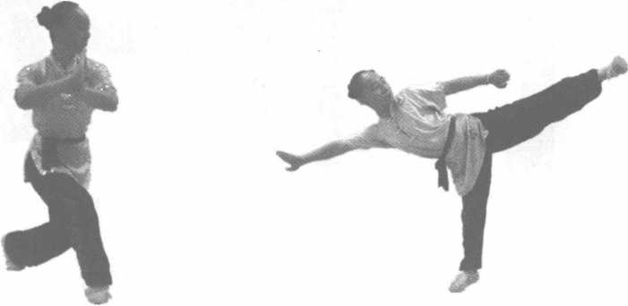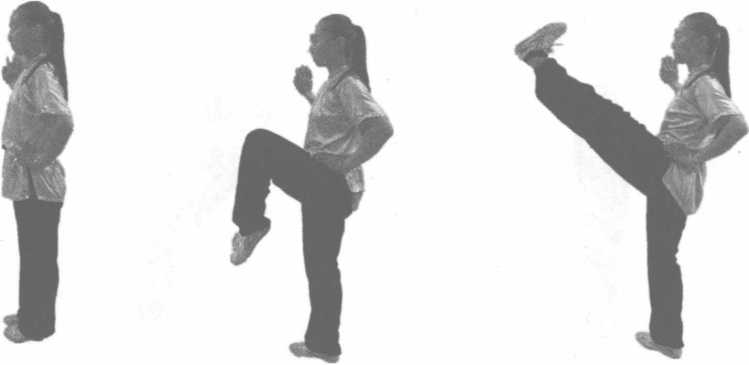 动作说明:右腿屈膝提起,大腿与腰平,右脚绷直(图3-65)。弹出时,要迅速猛力挺膝,向 前平踢(弹击),力达脚尖;大腿与小腿成一直线,高与腰平。左腿伸直或微屈支撑。两眼平视 (图3-66)。