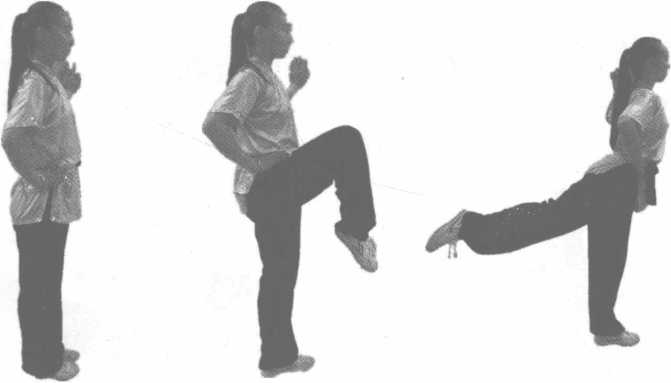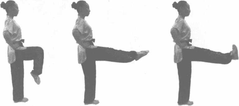 动作说明.•左腿屈膝前提,脚尖绷直或勾紧,徐徐向前上伸出(图3-57、图3-58)。练习时,左右 交替进行。
