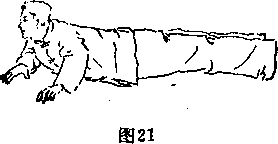 &后运式”的练习。“前运式”:&后运式”的练习。“前运式”:动作:此功分“前运式”与 身体放平伏于地面上,两手放于 头之前面,五指触地,两脚尖亦 触地。身体胸腹部微离开地面寸 许向前慢慢前运。前运时要闭气 (不呼吸),头部运至与两手相齐 时即抬头呼气。“后运式”:上动不停,臀部抬高,头部低下,双 目看裆部,身体缩回,恢复原伏地姿势。如此一前一后反复练习, 天长日久,指功和内劲就会加强。(图21)&后运式”的练习。“前运式”:&后运式”的练习。“前运式”:要点:此功主要功力在“前运式”,前运时要闭气,后运时不 闭气。