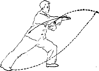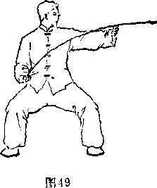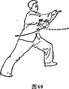 动作:上动不停,以右脚跟为轴,向后转身180度,变左弓 步,转体同时向前横劈右掌,掌 心向上,劈掌时左手掌横于右掌 下面,目前视。(图48)接着,右掌收回置于腰际;左掌横击,横击时掌心向下。两脚成马步,自向左视。(图49)上二势完成后,左脚变弓步,向前插击右掌。插 右掌时,左掌贴于右肘下,目前 视。(图50)一○二、要点:向后转体,左右击掌 要同时完成。办掌时要有力,要 —气呵成。
