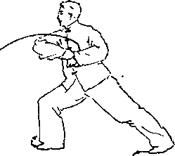动作:上动不停,双脚跳步 换位,即左脚换至后面,右脚换y 至前面成右弓步I同时变为右顶^肘,顶肘时,左手握于右腕部,目前视。(图55)要点:换步时,动作要快,要干净利落,不能拖泥带水。换步,顶肘要同时完成。图55