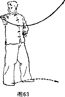 动作:上动不停,以右脚尖为轴,身体左旋90度,向前出右拳。 (图63)随即双手变掌,右掌由下向上、向外云拨,同时向前上右