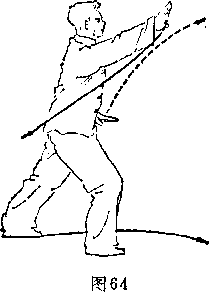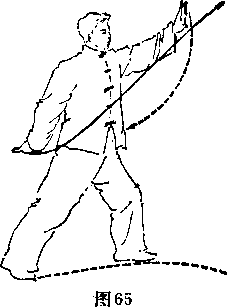 步,目视右手。(图64)接着,上左步,左掌由下向上、向外云拨。 (图65)再上右步,右掌由下向上、