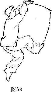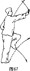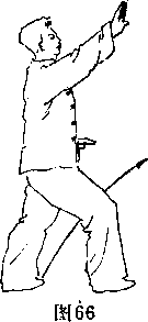 外云拨。(图66)同时右脚蹬地 跳起,左腿向前、向上摆起。(图 67)两臂在上挑的同时,由下向 前、向上摆动。到头顶上方时,