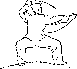 图73图73ff动作:上动不停,左脚落地, 右脚也相继于身前落地,随即两 腿变马步,左拳架于头之左上方, 右拳平肩向右冲出,拳心向下成 俯拳,眼看右方。、(图73)图73图73ff要点:(1)旋风腿落地换马 步时,右脚要内扣,左脚也必须 随右脚变动。(2)马步姿势不能 有起伏。(3)向右冲拳时要拧腰、 顺肩、沉髋。
