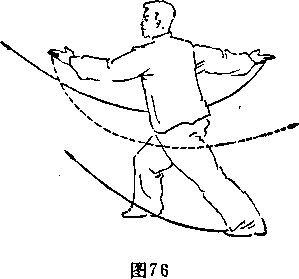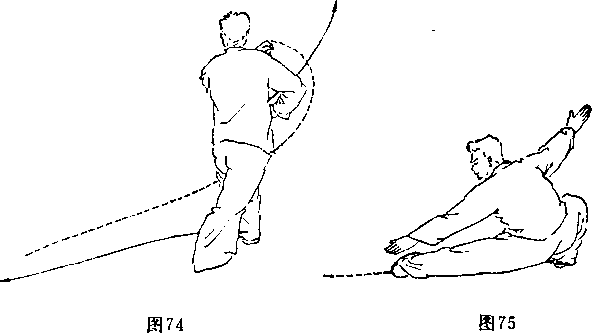 动作:上动不停,右脚向左脚后面进步,同时双拳变掌,右 手在左手内穿出,目光随动作扫视。(图74)接着,左腿挺直向前 成左仆步,脚尖内扣,全脚着地,右掌在左掌内穿出置于身后伸 直于头之后方》左攀沿左腿内侧前穿,目向左视。(图75)要点:此动作要眼随手、身随步、步随势,做到手、目I身、 法、步都协调一致。