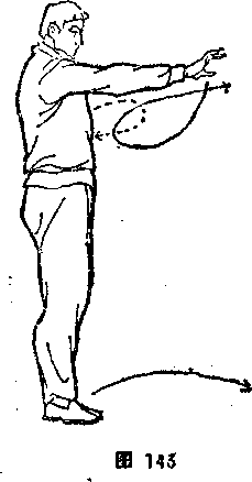 明14〗 142明14〗 142同时,右掌捋至腹前,掌心向下,右臂贴胸靠助;左掌由左后向 胸前平划,.再顺心口方向外旋翻掌,从右臂上向前甩出,掌心向 上,与眼平高体面向南,目视西南(图142)。左右方向,反复