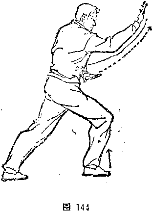(3 )活步圈拦——<预备势。同活步顺手摘(图43〉。② 右脚上步右腿屈膝,左腿蹬直,成右弓步。同时,左手阴挲由左 向前平划,再回捋至腹前,掌心向下,左臂贴胸靠肋;右手屈臂 收腕,从左臂上外旋翻掌向前甩出,掌心向上,与眼平高(图144)