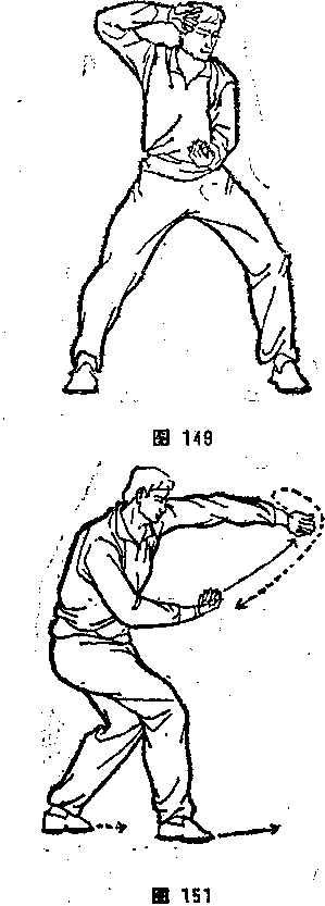 丨右拳内旋,用拳背击打右膝,再上举至右耳旁,屈臂垂肘,右腕 镦叠,拳心向前下,左拳外旋,用拳背击打右膝,停于右肘处, 拳心向上,两拳上下相对(见图147)。⑤同本节③(见图148)。⑥ 同本节④图149)。击膝时,左右交替击打,可以打出鼓点来, 七点为一套,其旋律是1、2——3、4——5、6、7。