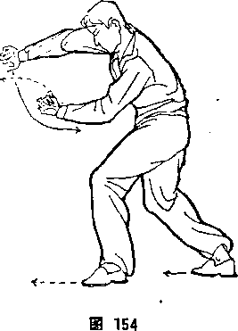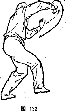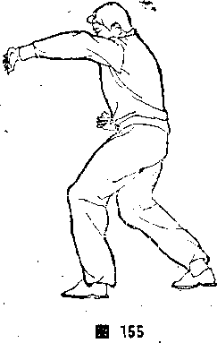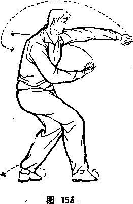 旋,从右臂上前穿微撑,左腕微翘,左小臂微横,左拳心向前。 体面向东,目视前方(图153).⑤左右交替穿撑,当打到场地尽 头处时,左拳经上向西盖出后回拉,左大臂靠肋,左小臂微向外