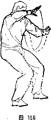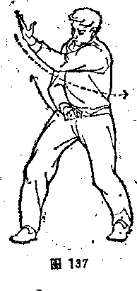 回卷,掌心向上,.左大臂靠肋;右内旋,从左臂上拧钴打出, 与肩平高,掌心向下。体面向北,目视前方。(图183>。继续演 练,往返无穷。