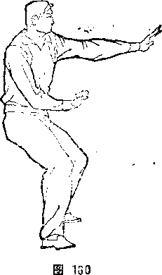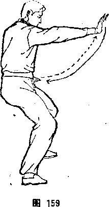 掌,顺心方向向前下沉打出,与肩平高,掌心向下;左掌不 动,掌心仍向上(图159)。⑤右掌微向上引,再外旋翻转回卷, 右大臂靠肋,右掌心向上;左掌内旋从右臂上拧钻打出,、与肩平 高,掌心向前下(图160)。左右甩打摘掌,反复无穷。