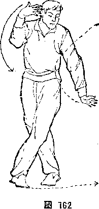 顺手摘。①面南而站,两脚并立,两臂下乘。目视前方(图161)。 ②左脚时东横跨,左腿屈膝;右脚从左脚后向东插步,.右腿蹬 直,成插步。.同时,左掌向右上向左甩至左大腿外,掌心向前, 含有领拉劲,右挈向左向上甩划至头的右侧,掌心向里。体面向 南,目视东南(图162)。③左脚向东横跨。同时,左掌;胸前外
