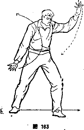 旋,向右经上向左上甩划至头左侧,掌心尚里右掌内旋,由右 向下甩划至右大腿旁,掌心向前。眼随手动(图163)。④右脚从 左脚后向东插步,右腿蹬直,左腿屈滕,成插步。右掌外旋,向 左经上向右上甩划至头右侧,掌心向里;左掌内旋,由左向下甩 划至左大腿外,掌心向前。眼随手动(图164)。⑤左脚向东提
