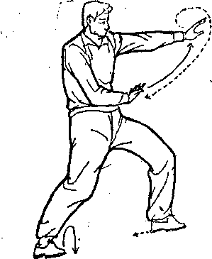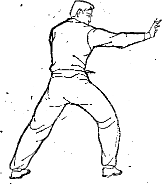 拳内旋转腕用拳背向前崩弹,拳心向前,两臂直伸如弓,微低于 肩。拧腰坐胯。体面向北,目视西北(图⑨右脚里扣,从左 112,