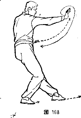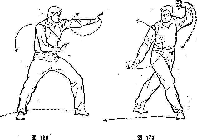 卷,右大臂靠肋,右掌心向上;左掌内旋,从右臂上拧钴打忠, 与肩平高,掌心向下。同时,左腿向前弓(图169)。⑩左脚从右 脚后向西插步败势,同本节②,但方向相反(图170)。?右膦跨